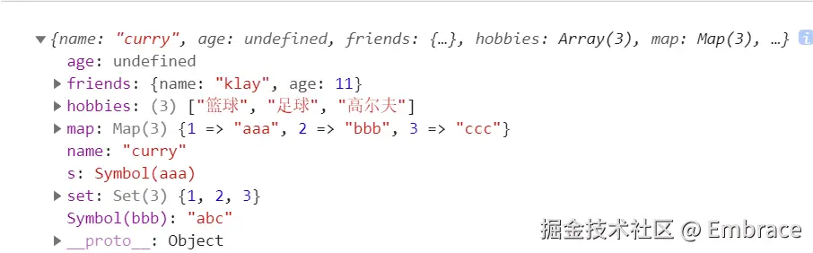 obj的方法属性并没有被拷贝到newObj中; - JSON序列化只能对普通对象进行深拷贝,如果对象中包含函数、undefined、Symbol等类型的值是无能为力的,会直接将其忽略掉;
