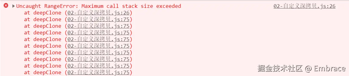 如果没有处理循环引用,那么就会不断递归,最终报错栈溢出: