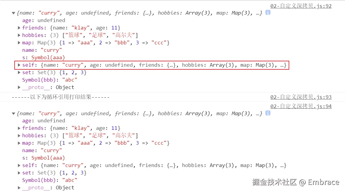 - 只需要将原对象作为WeakMap中的key,其值对应存放我们新创建出来的对象即可,下一次递归时进行判断WeakMap中是否存有该对象,如果有就取出返回;