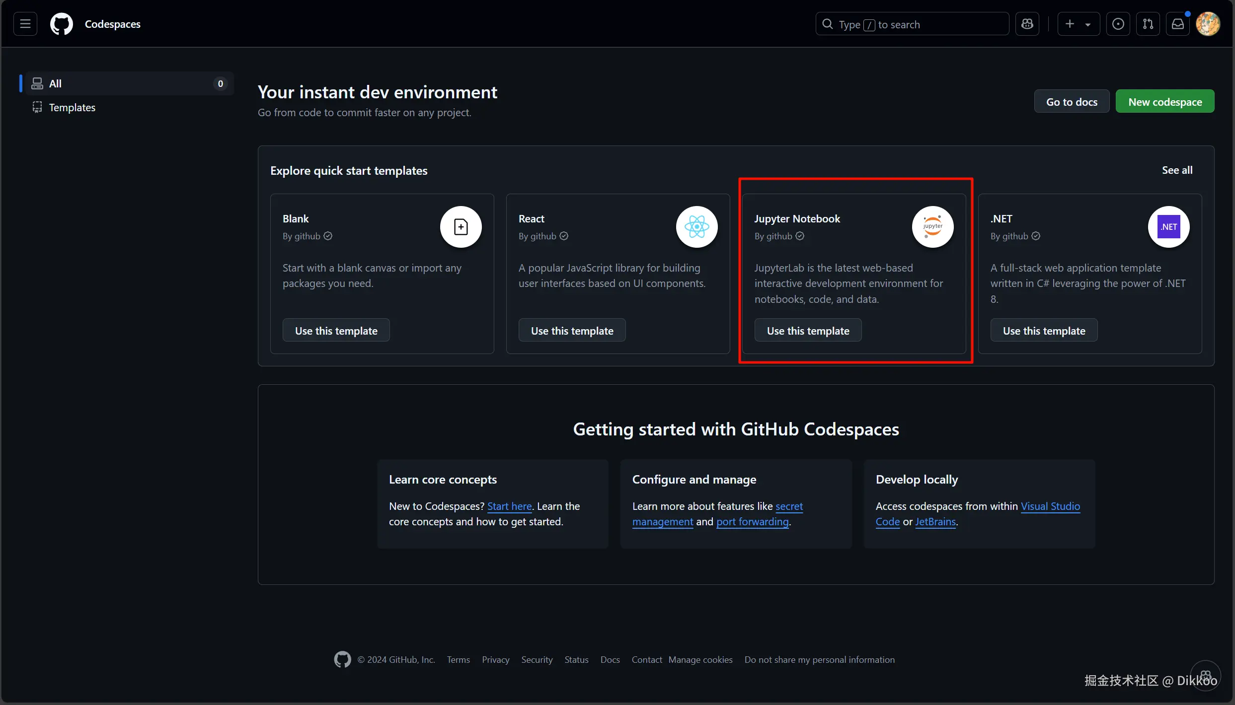 我们这里选择 Jupyter Notebook 进行创建环境。创建好环境后,可以进入网页版 VS Code 的界面,这就是 CodeSpace 提供给我们的在线编程环境。