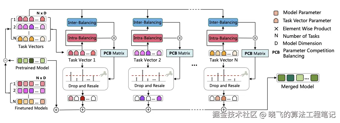 PCB-Merging旨在调节每个任务和参数的缩放因子,实现任务内部和平衡任务之间的相互平衡。具体而言,使用参数竞争平衡(PCB)矩阵 βi∈Rd 来调整每个任务模型 θi∈Rd 中参数的规模,从而得到最终的融合模型,具体如下:
