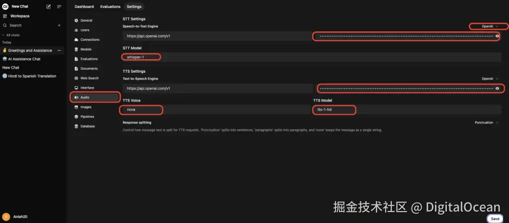 再次导航并点击“设置” -> “音频”以配置和保存音频 STT 和 TTS 设置,如上图所示。