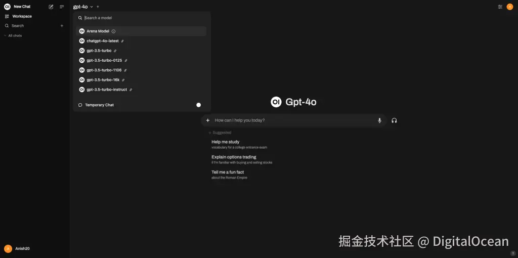 现在,Open WebUI 将自动检测所有可用的 OpenAI 模型。从列表中选择 GPT-4o。