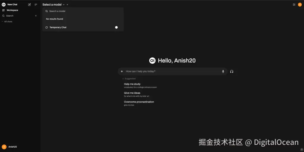 登录到 Open WebUI 仪表板后,你应该注意到没有模型正在运行,如下图所示: