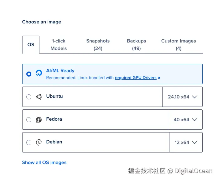 2、创建 GPU Droplet - 登录你的 DigitalOcean 账户,创建一个新的 GPU Droplet,并选择 AI/ML Ready 作为操作系统。这个操作系统镜像会安装所有必要的 NVIDIA GPU 驱动程序。你可以参阅我们的官方文档了解如何创建 GPU Droplet。