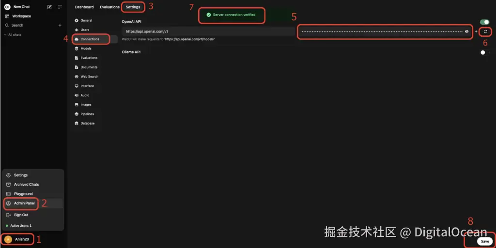 在本步骤中,你将添加你的 OpenAI API 密钥到 Open WebUI。