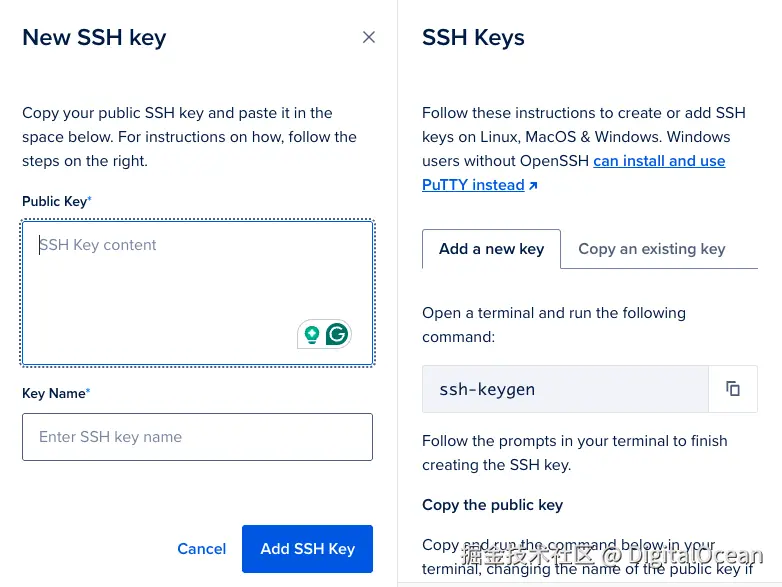 3、添加 SSH 密钥进行身份验证 - 需要 SSH 密钥来对 GPU Droplet 进行身份验证,通过添加 SSH 密钥,你可以从终端登录到 GPU Droplet。