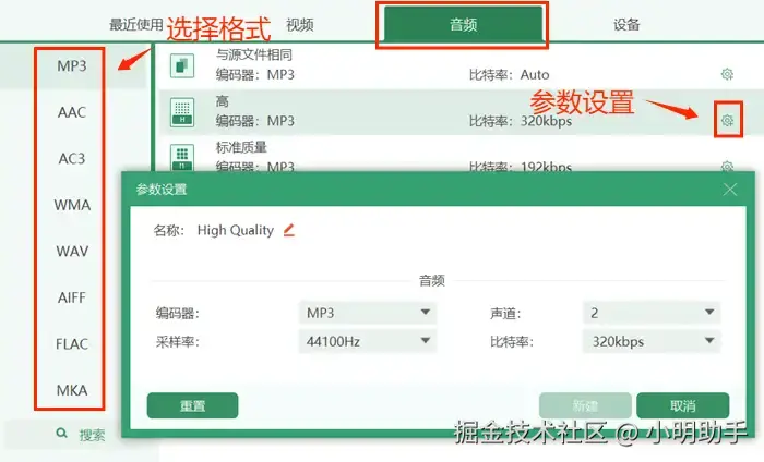 第三步: 进入格式设置界面后,点击上方的【音频】,选择自己需要的输出格式。还可以点击界面右侧的小齿轮按钮进行【比特率】等参数设置。