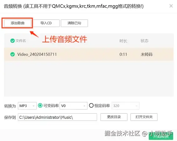 第二步: 进入音频转换界面后,点击【添加歌曲】,上传需要进行转换的音频文件。