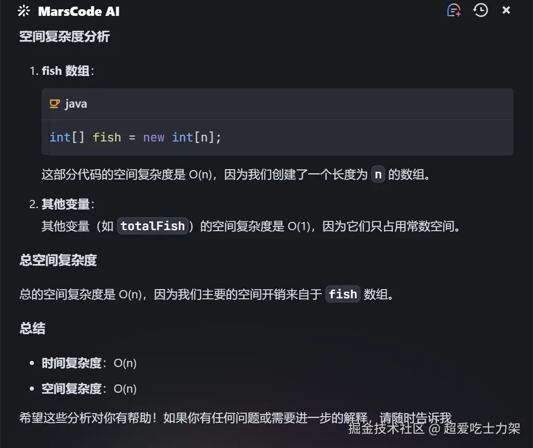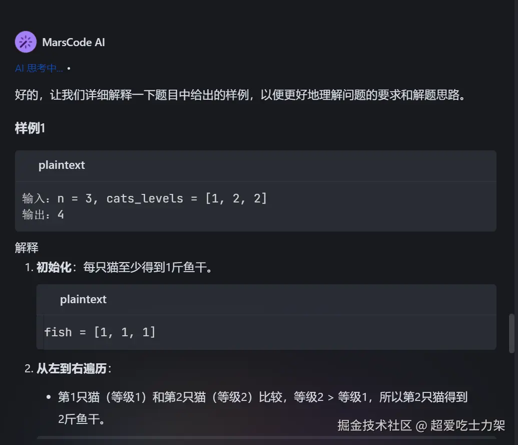 通过 MarsCode AI 工具的辅助,我能够高效解决猫星球鱼干分配问题,同时深入理解了分配问题的核心逻辑。这不仅提高了刷题效率,也优化了算法学习路径。AI 的强大功能让编程学习更具乐趣,同时能帮助我快速适应更复杂的算法问题。