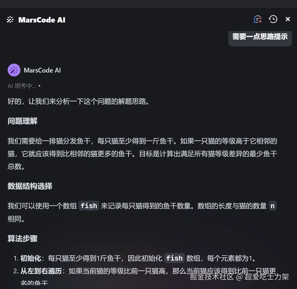 MarsCode AI 能够通过简明的逻辑分析快速提供解题思路: