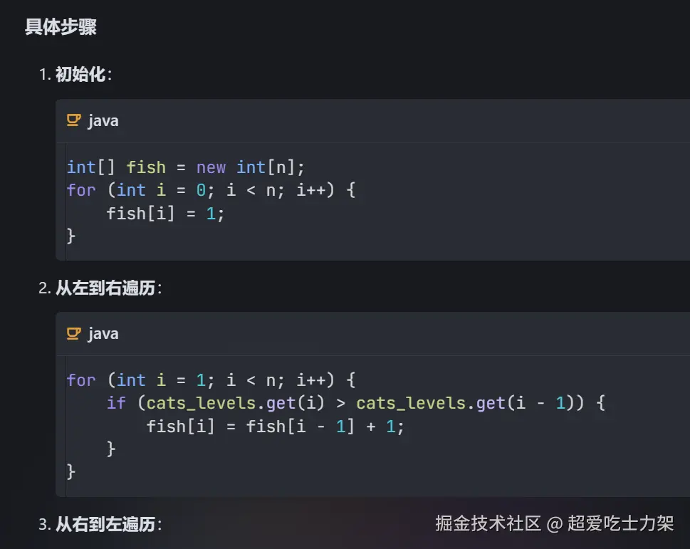 - 从右到左遍历: 确保每只猫比右边等级高的猫多分配鱼干。