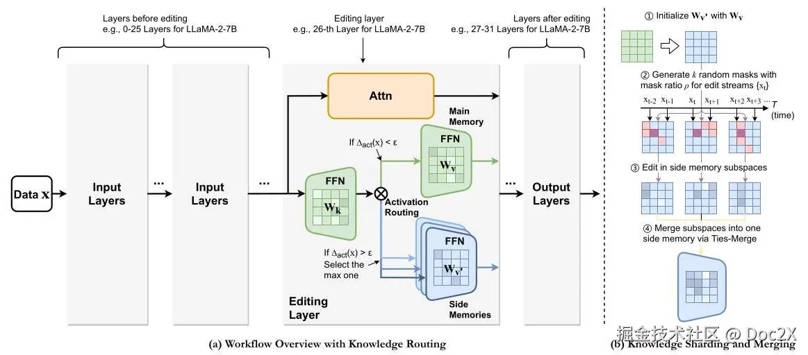 如图2所示,WISE包含两个关键组件:1) 侧记忆设计:i) 侧记忆:侧记忆是一个内存容器,初始化为LLM的某个FFN层的副本,存储编辑流;ii) 记忆路由机制:类似于检索,采用路由激活组件来识别编辑范围,在推理过程中路由主(原始)或侧记忆;2) 知识分片与合并:i) 随机内存子空间中的知识:为了使编辑在适当的知识密度并避免遗忘,我们将侧记忆分片为几个随机子空间进行编辑;ii) 知识合并:我们利用模型合并技术将不同的记忆分片合并为一个侧记忆,而不会丢失知识。