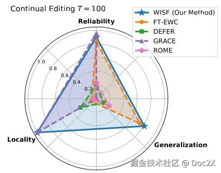 图1:可靠性、泛化性和局部性之间的度量三角形。ZsRE数据集,持续编辑次数 ,LLaMA-2-7B。基于长期记忆(ROME和FT-EWC)和工作记忆(DEFER和GRACE)的编辑方法显示出度量中的不可能三角形,而我们的WISE在所有三个度量中都处于领先地位。