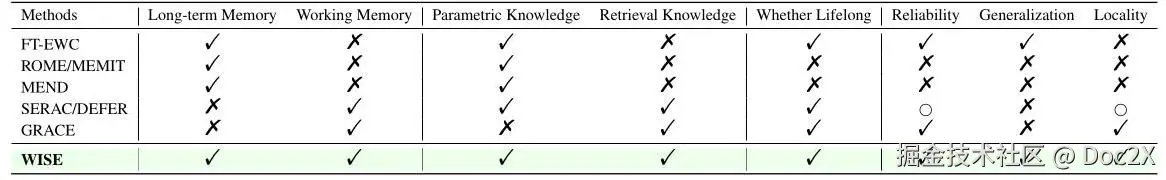 表1:当前模型编辑方法的比较。"√"表示"是"和"支持良好",X表示"否"或"支持不佳",""表示"支持较少"。可靠性、泛化性和局部性这三个指标表示在终身(持续)编辑中的表现。