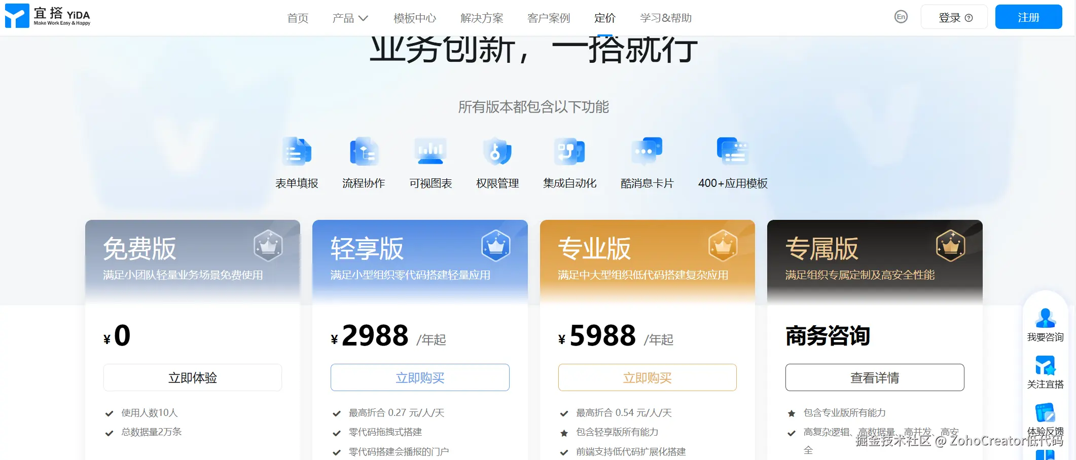 5、免费版: Zoho Creator低代码开发平台针对不同企业的需求,有不同的价格套餐,为公司的挑选带来了稳定性和便捷性。而且产品提供免费计划,可供1位用户使用,提供1款应用的访问权限、250MB存储和1000条记录。用户可以随时根据需要选择升级为付费计划。