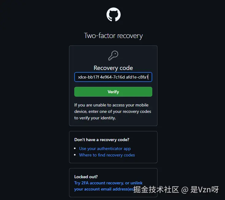 这就要再回到开启2FA认证的时候,服务端除了会生成一个密钥(类似公钥)提供给客户端进行绑定,还会同时提供一份Recovery Code,会提示用户将其可靠保存起来。