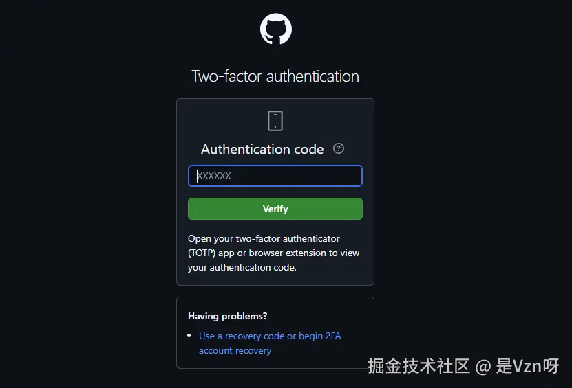 看下GitHub的2FA登录实现。在开启2FA功能的时候,需要在提前在手机上安装一个APP并绑定到GitHub账号上。这样后续在输入账号密码之后,还需要打开APP并将APP中生成的鉴权码填入到界面上进行二次验证,验证通过之后方可进入系统。