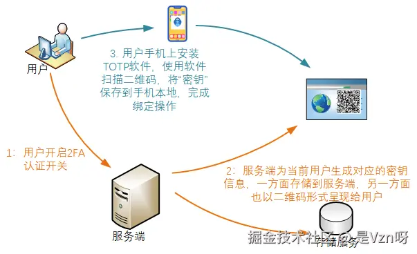 用户密钥因子是服务端为用户生成的授权密钥,计算生成验证码的时候,服务端和客户端都要使用同一个密钥进行计算,所以服务端为用户生成密钥后,除了服务端要保存该密钥与用户的绑定关系,还需要将此密钥提供给用户、由用户将其绑定到手机上的TOTP软件中(所谓绑定,本质上就是将服务端生成的密钥存储到手机的TOTP软件中)。绑定完成后,服务端和客户端就都拥有相同的用户密钥信息了。