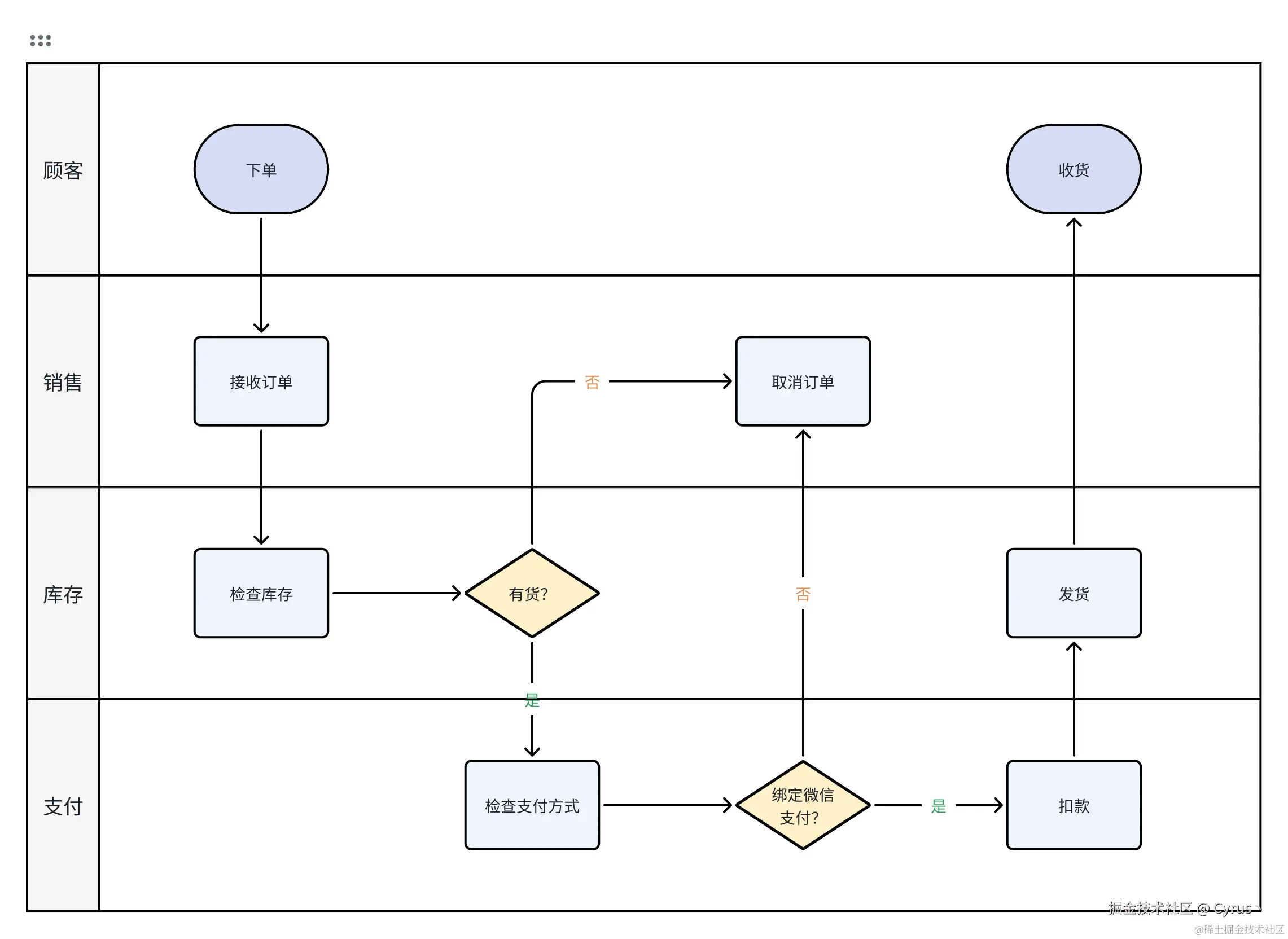 - 泳道:表示不同的角色或部门。