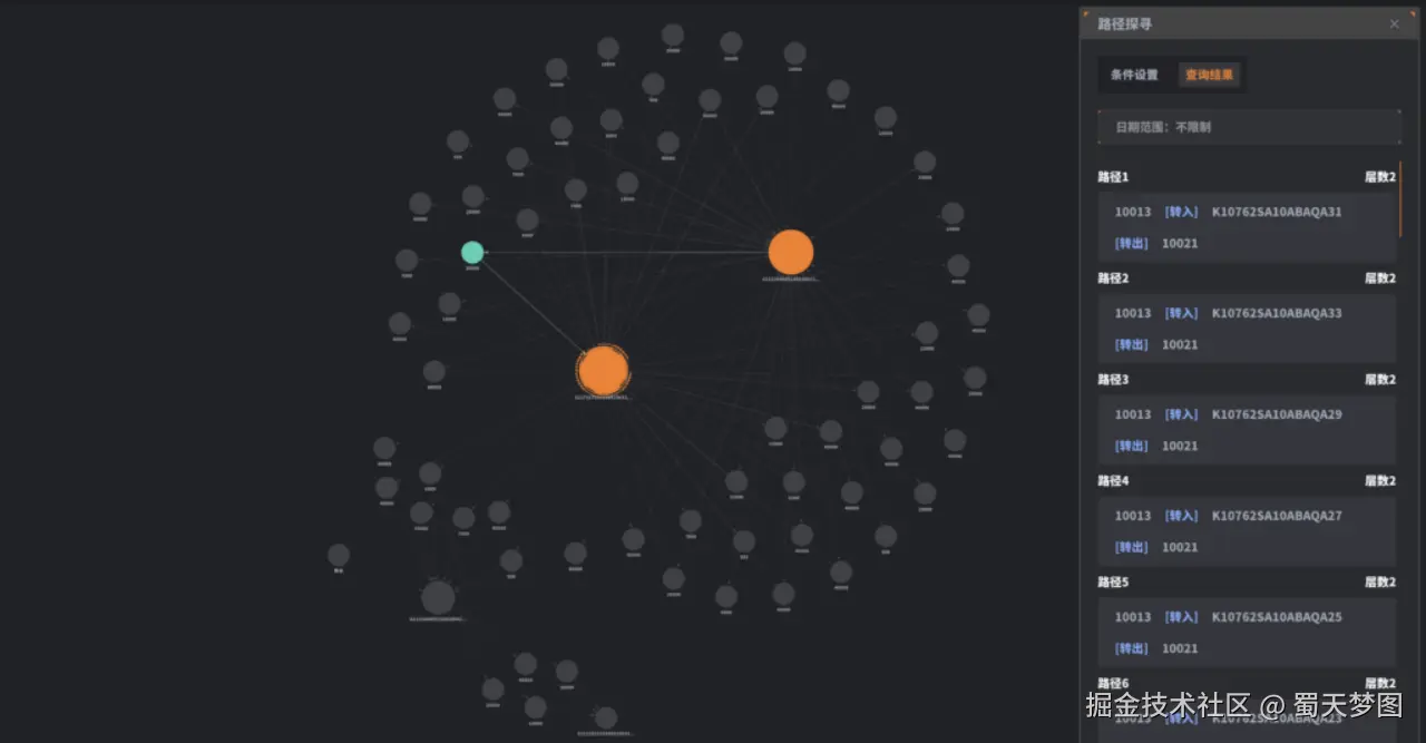 选中目标账户的转入交易所关联的2个账户,进行交易路径挖掘