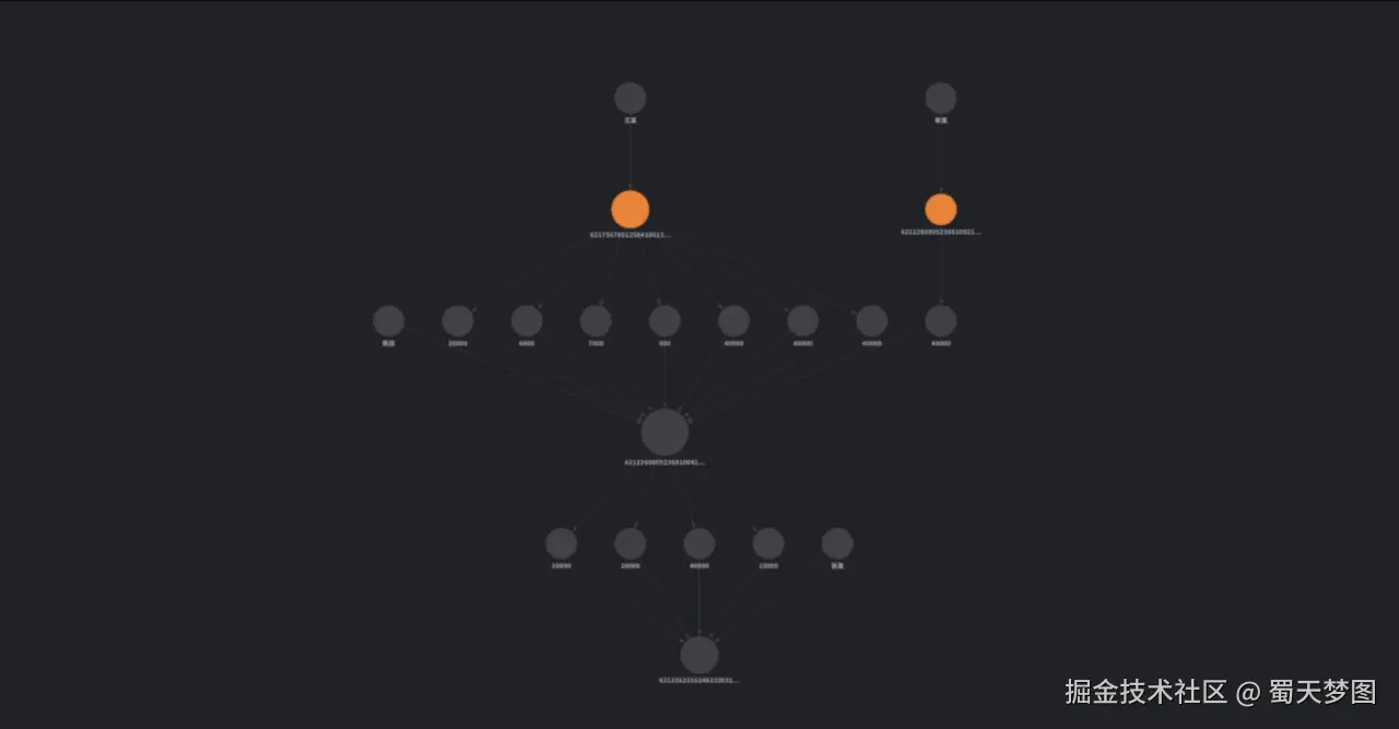 进一步分析探索,发现更多的异常账户和交易行为,而交易形态也逐渐形成交叉网络,均符合密集交易特征,并且呈现典型的“纺锤体”洗钱交易模式