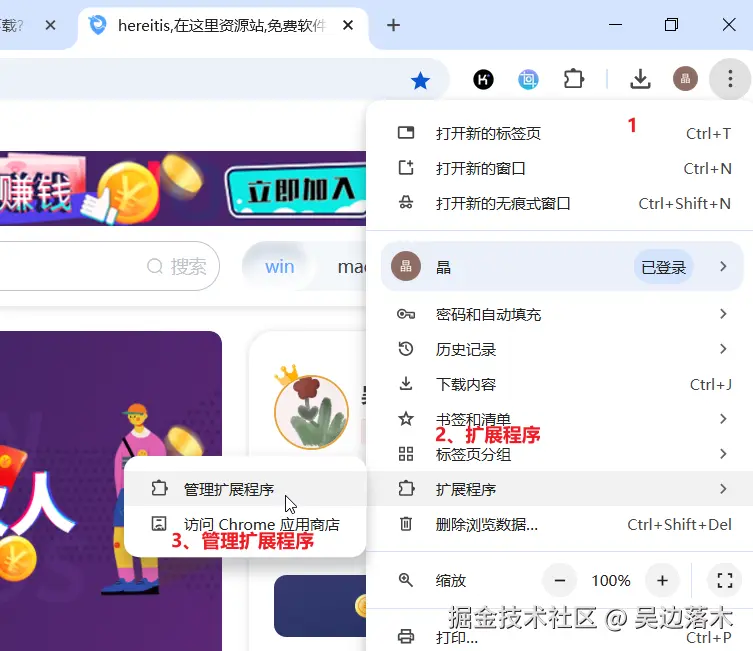 接下来,打开 chrome 浏览器的扩展程序管理菜单,有两种方式: