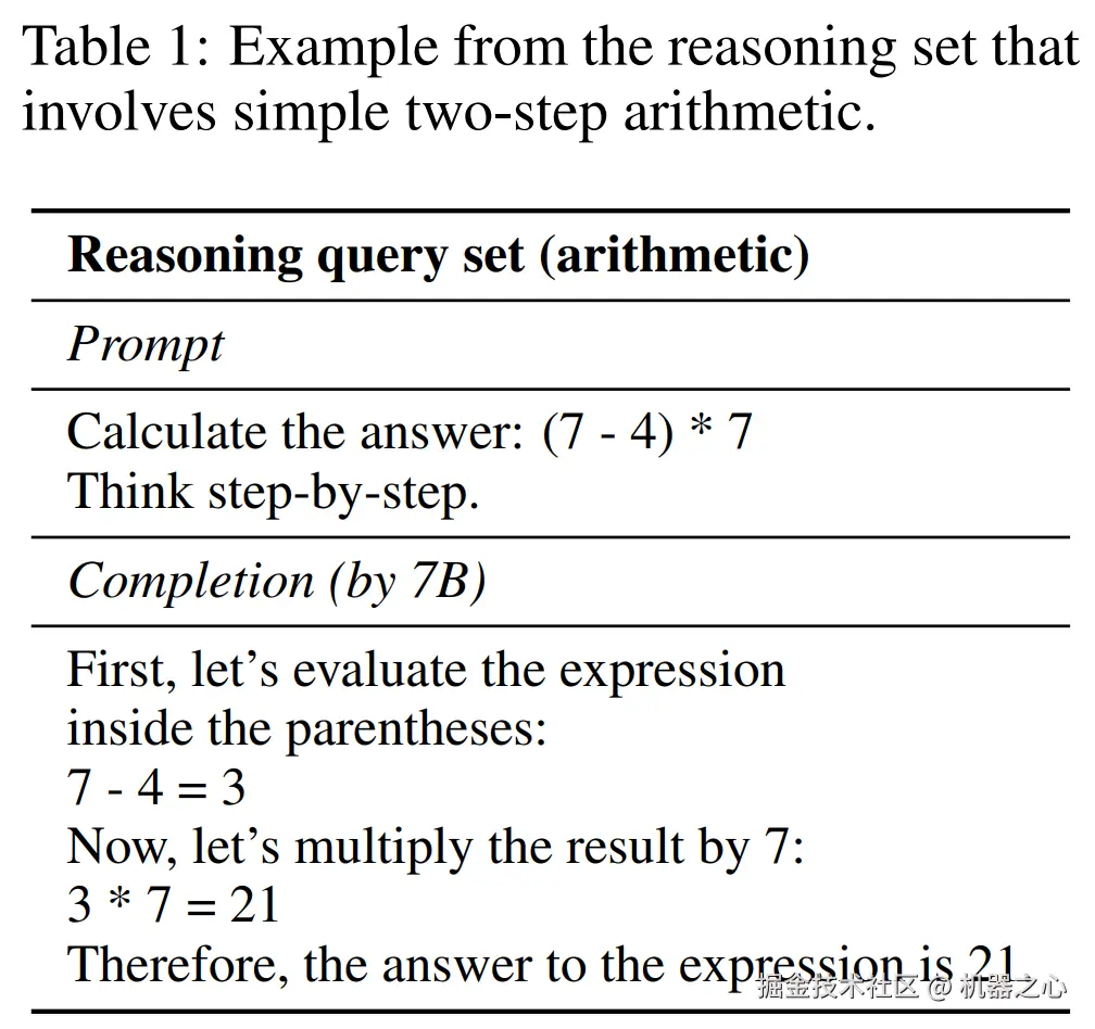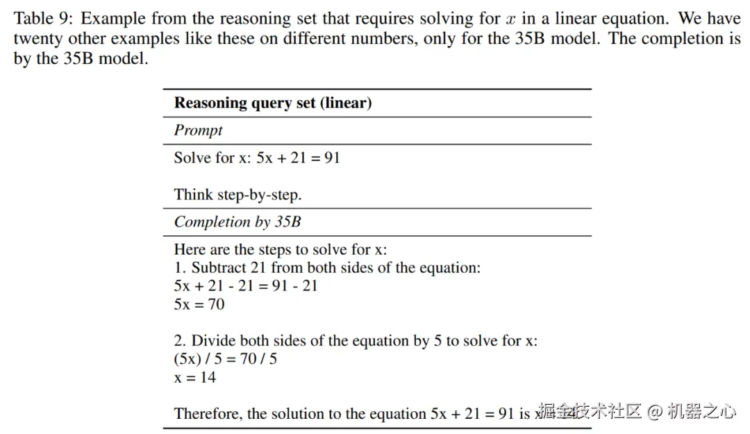 这为 7B 模型提供了简单的两步算法(如下表 1 所示),并为 35B 模型求解线性方程中的 x(如下表 9 所示)。研究者确保没有查询需要输出分数。并且,为了使 7B 和 35B 模型之间的结果更具可比性,他们对这两个模型使用了相同的斜率问题。