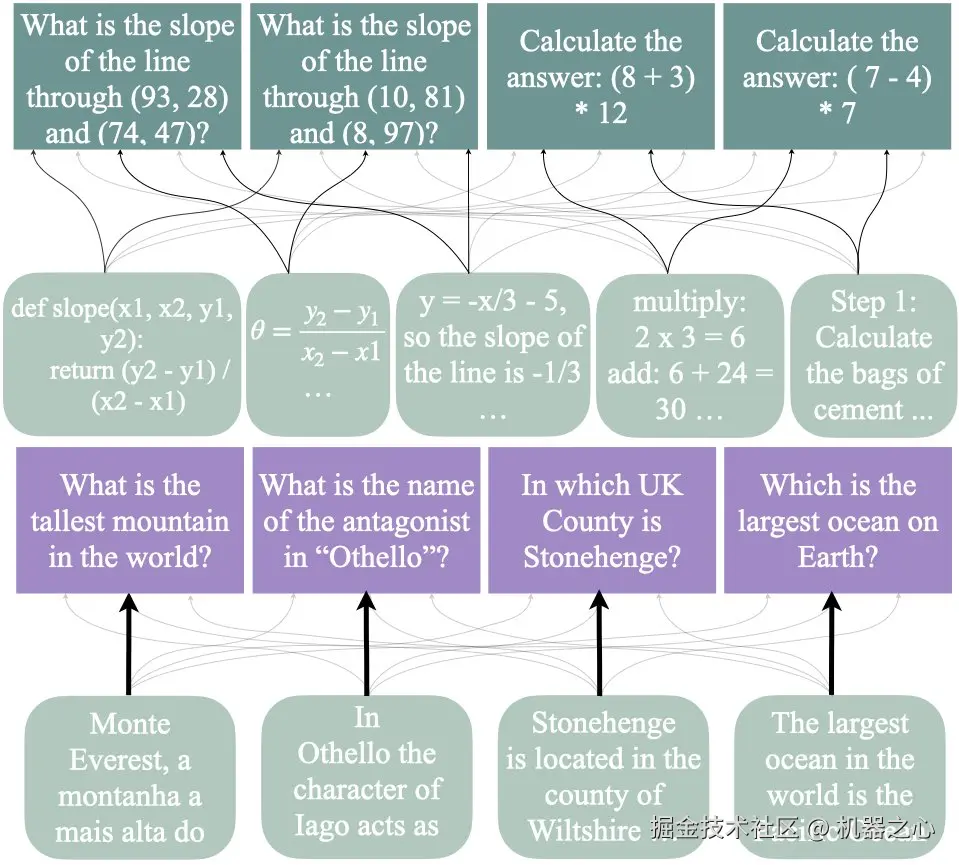 对于事实问题,答案往往表现出很大的影响力,而对于推理问题则不然(见下图底行)。此外,该研究发现的证据表明代码对推理既有正向影响,也有反向的影响。