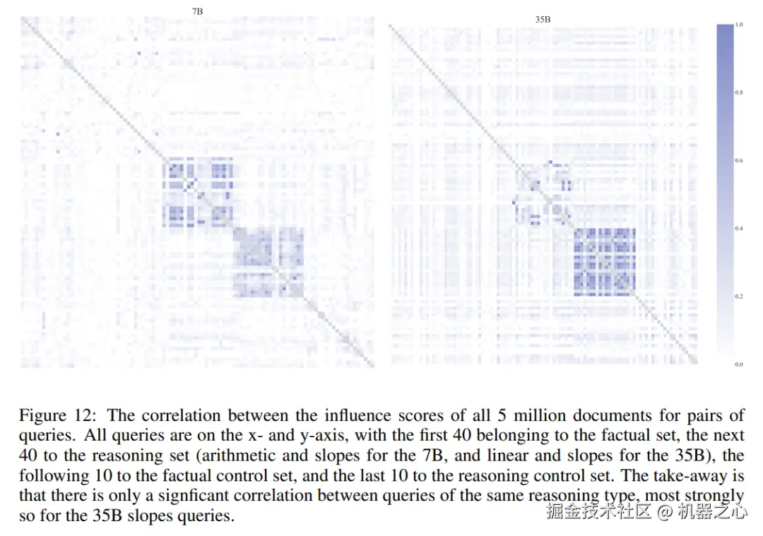 发现 1:对于具有相同底层推理任务的查询,文档的影响力得分之间存在显著的正相关性,表明了这些文档与「需要对不同数字应用相同程序」的问题相关。
