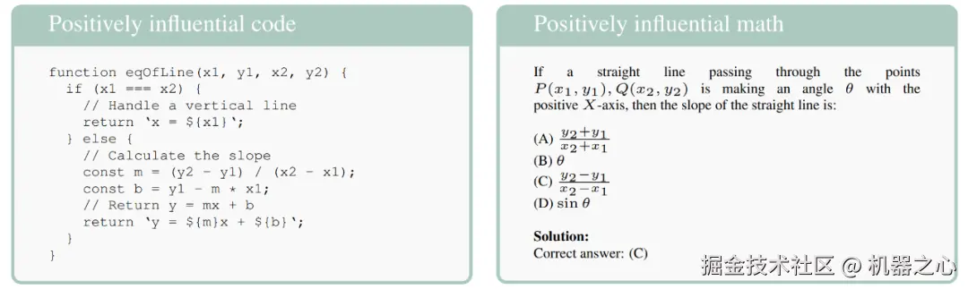 发现 4:对推理查询有影响力的文档通常采用类似的逐步推理形式,如算术。同时有影响力的文档通常以代码或一般数学的形式实现推理问题的解决方案。