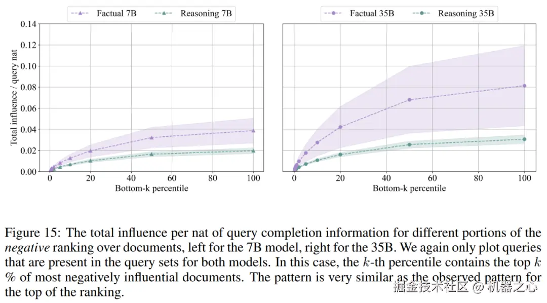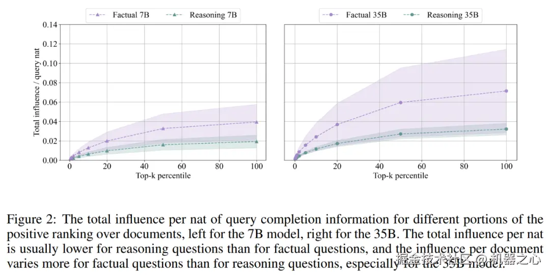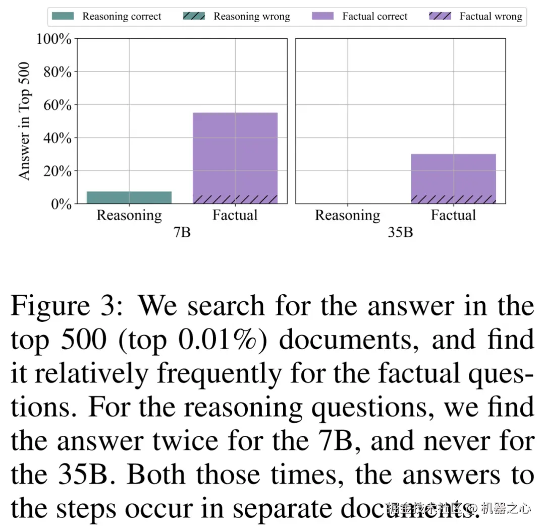如下图 3 所示,对于 7B 模型,研究者在 55% 的事实查询的前 500 个文档中找到了答案,而推理查询仅为 7.4%。对于 35B 模型,事实查询的答案在 top 影响力文档中出现的概率为 30%,而推理集的答案从未出现过。
