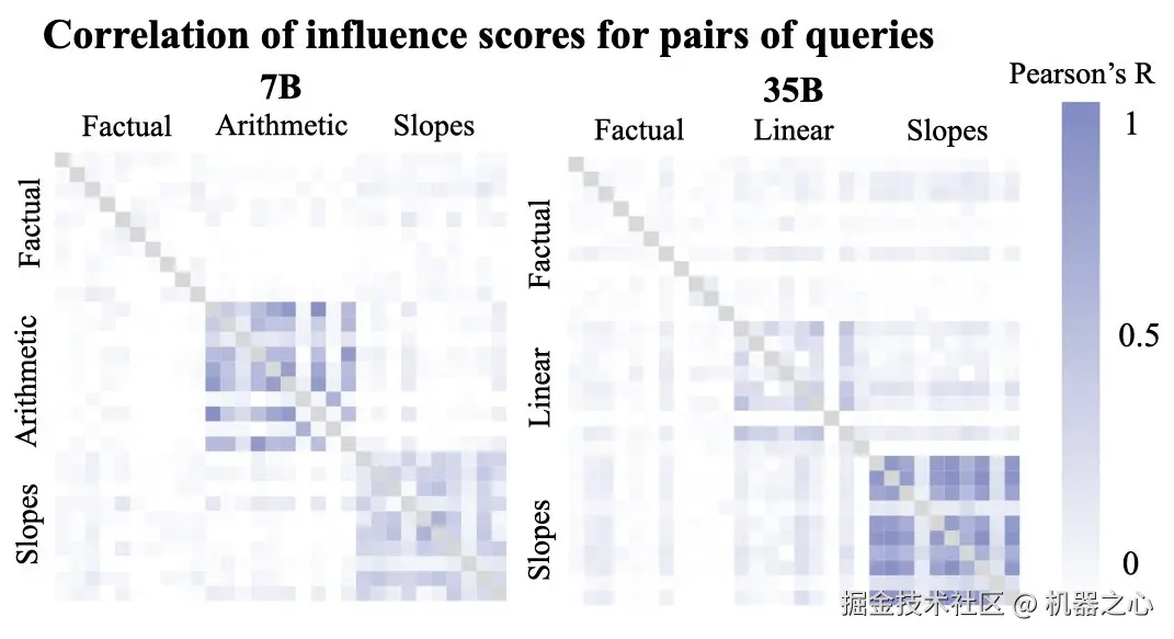 研究者想要比较预训练数据对不同大小模型(7B 和 35B)推理的影响,因此他们选择了两个在相同数据上训练的模型。其中,每个模型只需要对 Hessian 进行一次 EK-FAC 估计,但公式 1 中的其他项要求每个文档 - 查询对通过模型进行两次前向和后向传递。
