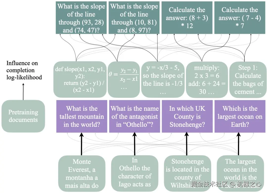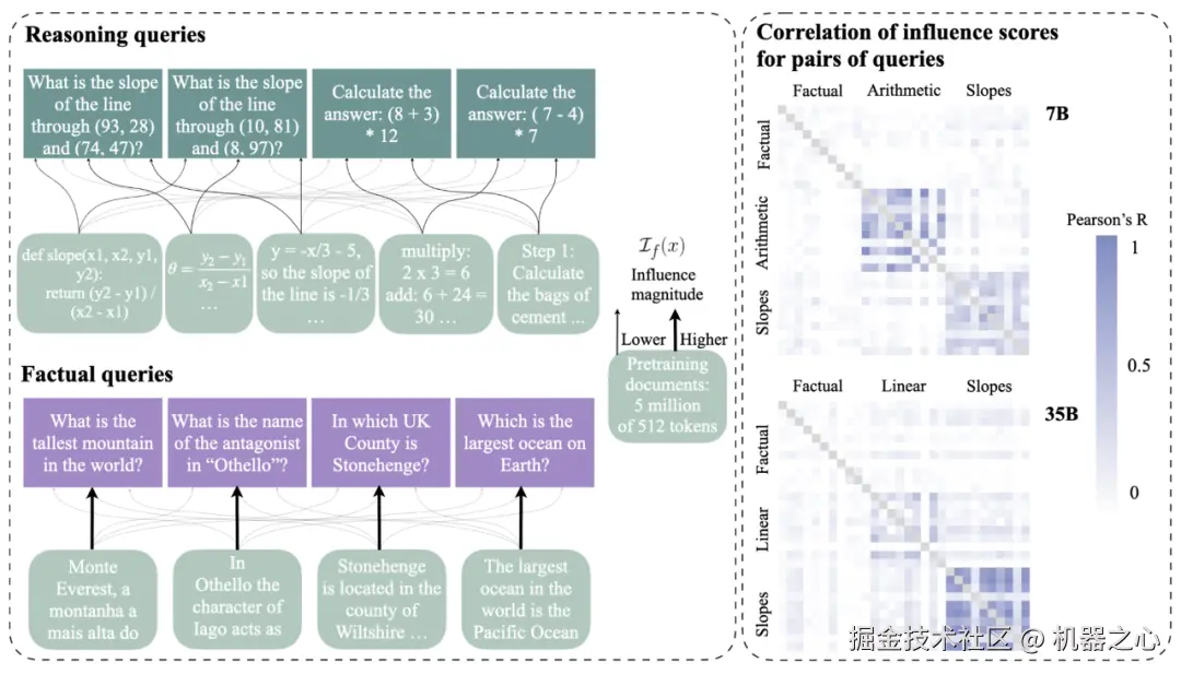 作者使用影响函数来估计预训练数据对两个 LLM(7B 和 35B)完成事实问题回答(下图左)的可能性,以及简单数学任务(3 个任务,其中一个显示在右侧)的推理轨迹的影响。
