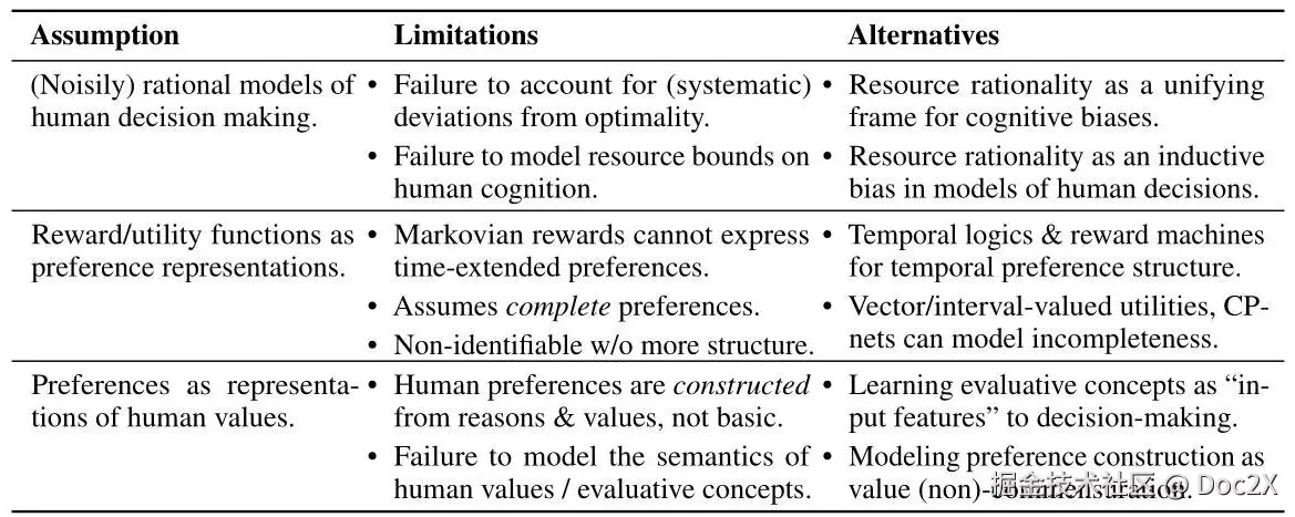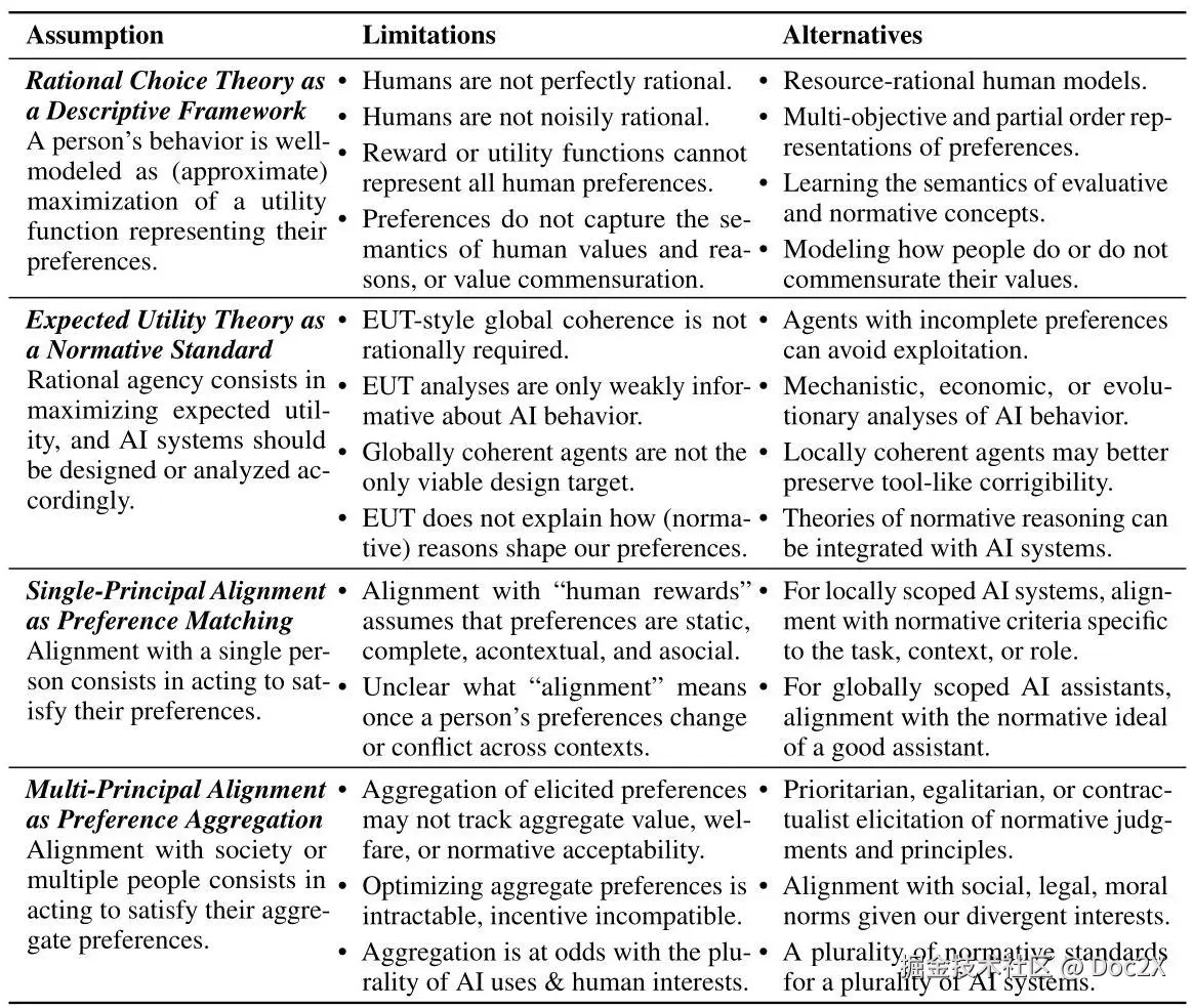 表1:四个论题,它们表征了AI对齐的偏好主义方法,并总结了它们的局限性和替代方案。