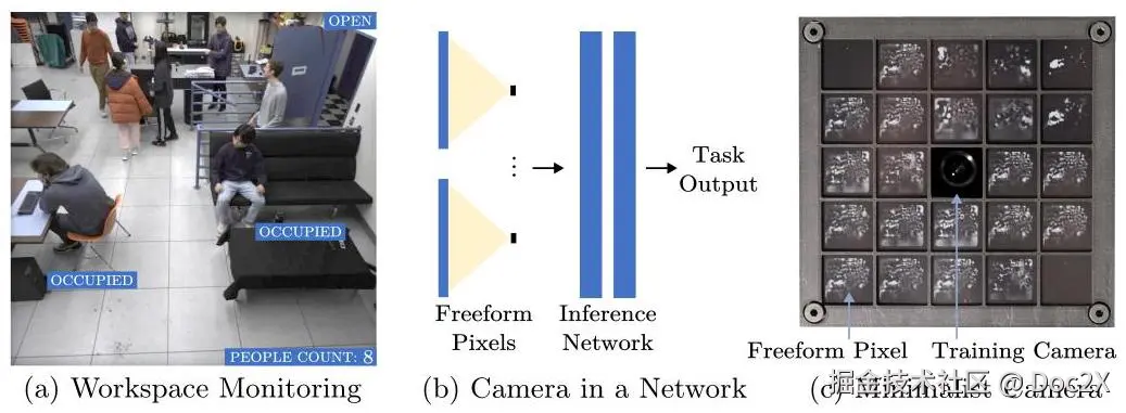 图1:使用极简视觉监控工作空间。(a) 任务是计算人数、跟踪指定区域的占用情况以及检测门何时打开。一个由摄像头和推理网络组成的极简视觉系统可以使用少量自由形式像素来执行这些轻量级任务。(b) 整个系统可以建模为一个单一网络。一旦该网络经过训练,第一层就指定了摄像头的设计,其原型如图(c)所示。该系统可以计算房间内的人数(使用2个像素)、跟踪每个区域的占用情况(每个区域使用2个像素)以及检测门何时打开(使用2个像素)。鉴于其测量的数量很少,极简摄像头可以完全自供电。