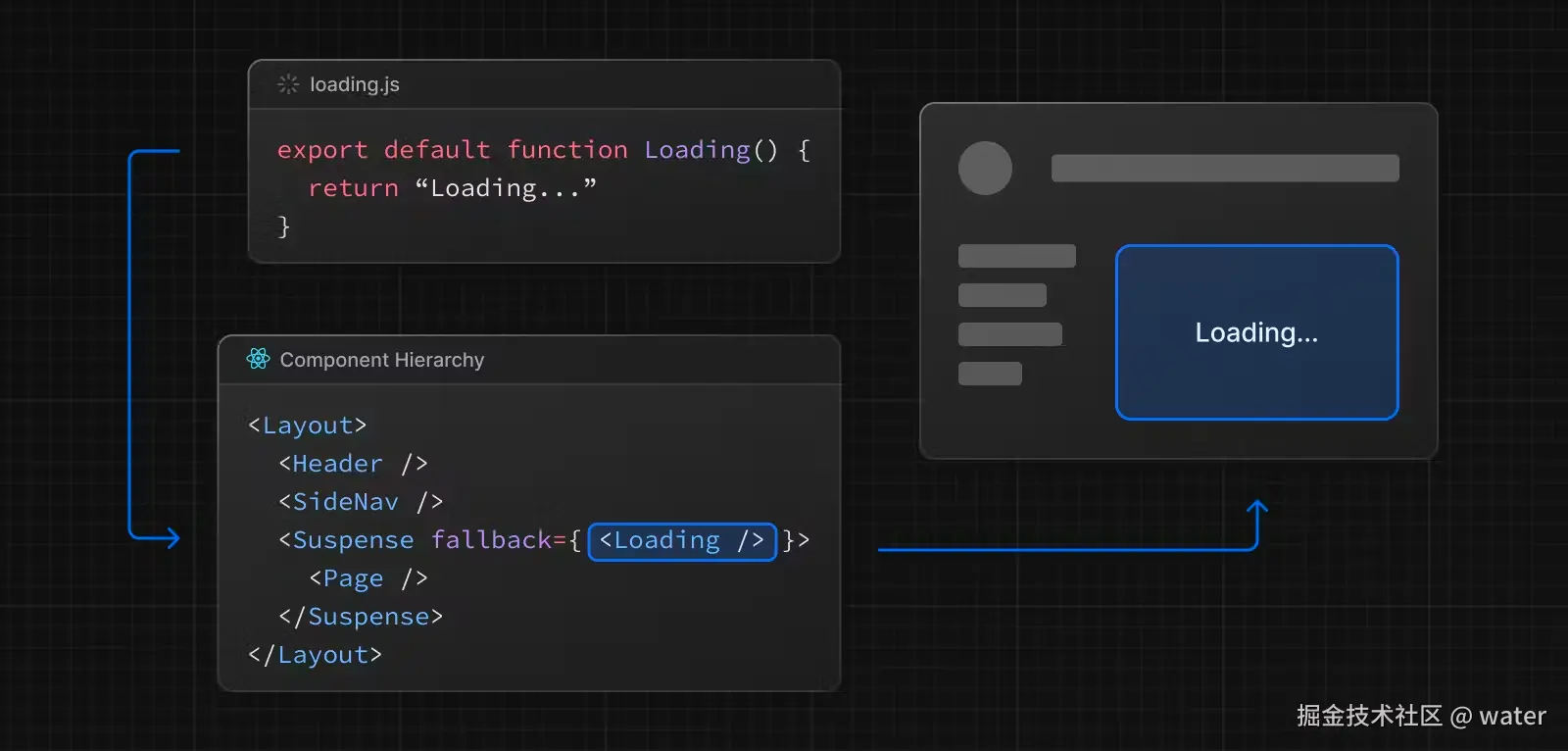 这样在访问这个路由的开始会先显示这个 loading 的 ui,等到路由加载完成后才会显示路由的内容。
