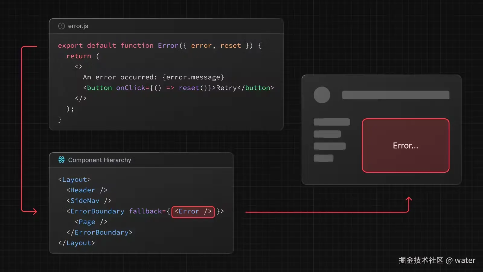 在嵌套路由中每个文件夹都有错误页面的话,就会生成嵌套的错误捕获,以最近的先捕获