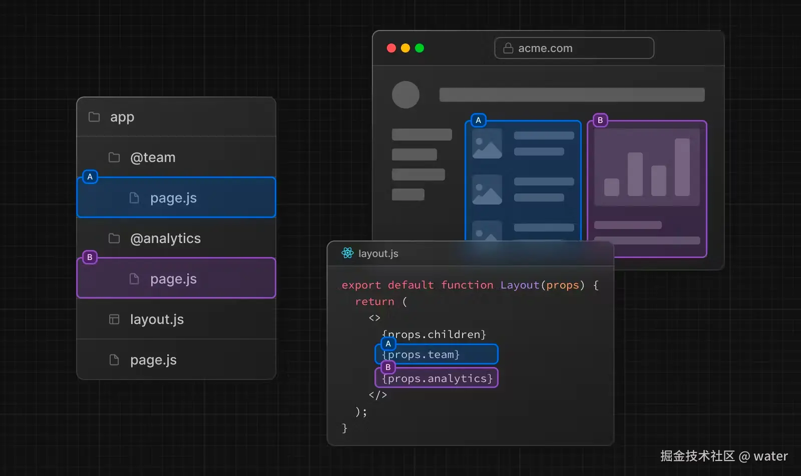上面就是定义了两个并行路由页面。在 app/layout.js 接受@analytics 和@team 两个命名插槽。并且可以在 layout.js 中使用 props.analytics 和 props.team。