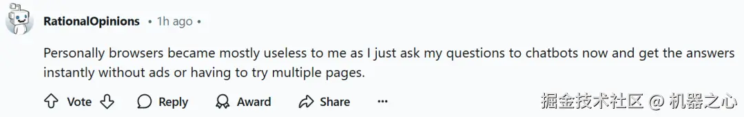 不过也有网友并不看好:「就我个人而言,浏览器对我已经没什么用了,因为我现在只需向聊天机器人提问,就能立即得到答案,而且无需广告或尝试多个页面。」