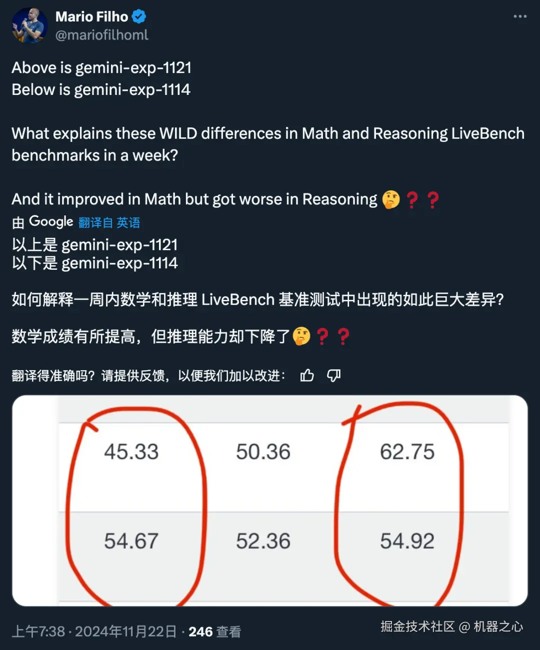 比如有人就发现在 LiveBench 上,一周后更新的 Gemini-Exp-1121 版本,在数学和推理能力上反而比不上 Gemini-Exp-1114,令人疑惑。