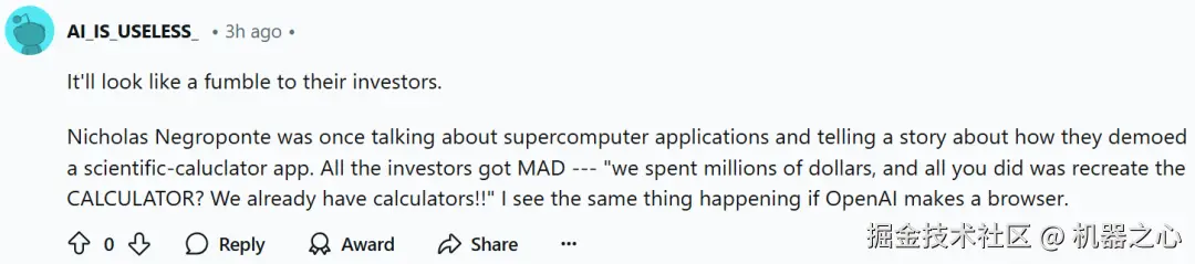 还有人用一个故事表达了自己的观点:「Nicholas Negroponte 曾经讨论过超级计算机的应用,并讲述了一个关于他们展示科学计算器应用的故事。所有的投资者都非常生气 ——『我们花费了数百万美元,而你们所做的只是重新创建了计算器?我们已经有计算器了!』如果 OpenAI 开发一款浏览器,我认为可能会发生同样的事情。」