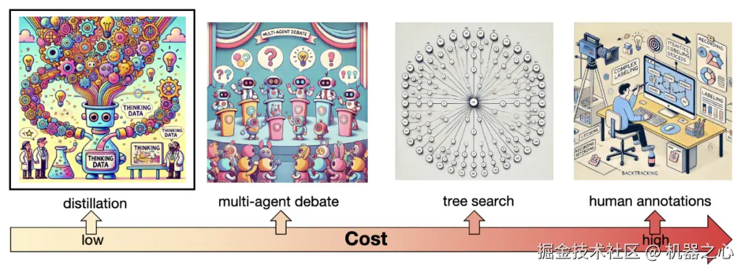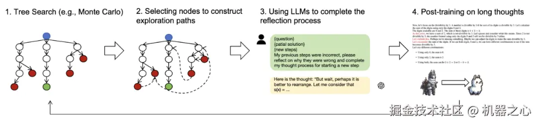 人类解决问题很少遵循一条通向成功或失败的线性路径。相反,人们在遇到障碍时会经常停下来反思、回溯并修改他们的方法。这个自然过程反映了长思维的特征。通过详细记录人类如何解决问题,我们可以生成真实的长思维训练数据。但是这种方式需要依赖大量极高质量的人工标注,并且随着问题难度的升级,标注的难度也会大幅上升。