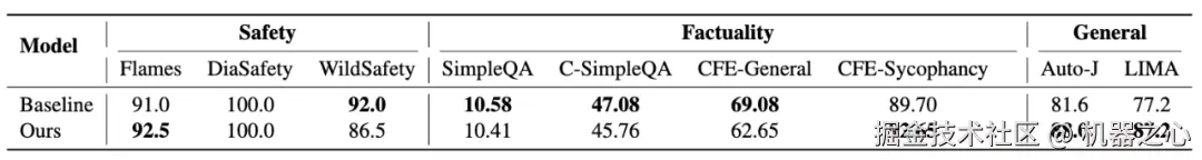 基于 Qwen2.5-72B-Instruct,经过 o1-mini distill 的数据 SFT 前后,模型在安全性、幻觉(事实准确性)、以及一些通用场景任务下的表现性能对比。