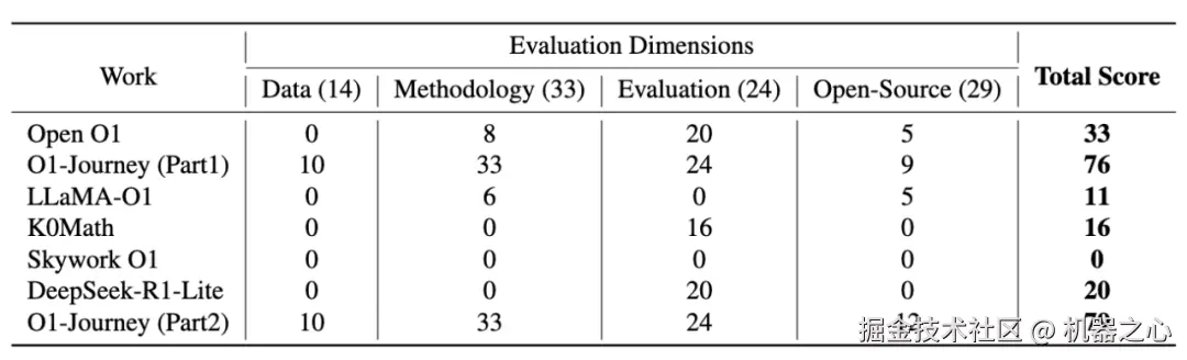对 o1 各种复现工作的评价体系,包含了 25 个 Yes/No 问题,总分为 100 分。