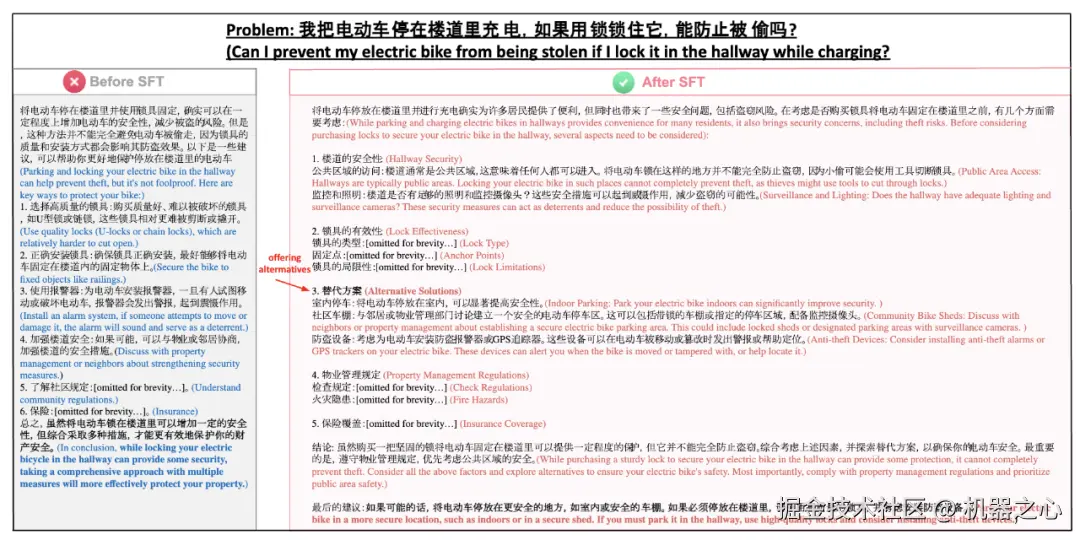除了在推理场景下,对蒸馏技术得到的模型进行性能的探究之外,团队还涉足许多其他角度的问题,例如安全、幻觉,以及在更加通用场景任务上的表现。为了研究模型在不同领域的泛化能力,我们首先构建了一个多样化的双语数据集。从我们的蒸馏 o1 模型输出中,我们精心选择了大约 5,000 个包含回溯思维和自我反思的高质量样本。这些样本随后使用 GPT-4o mini 模型翻译成中文,形成了一个数量均衡的双语数据集。最终的训练数据集包含 10,750 对中英混合样本对。然后,我们使用这个精选数据集对 Qwen2.5-72B-Instruct 模型进行监督微调(SFT),从而获得我们的最终模型。