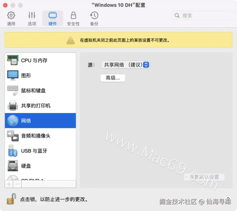 转到虚拟机的“配置”>“硬件”>“网络”>“源”,“共享网络(建议)”选项应默认已设置。如果您已经设置了“共享网络”,但在 Windows 中仍然遇到网络问题,请将其切换到“桥接网络:默认适配器”,并验证在这些模式下能否正常使用 网络。
