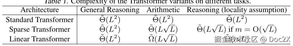 上述关于一般动态规划(DP)问题的发现引出了一个问题:哪些问题是高效的Transformer能够高效解决的?为了回答这个问题,我们首先研究了一个基本的推理任务:评估算术表达式(Feng et al., 2023)。值得注意的是,我们发现对于这两种架构,复杂度下限可以改进为 ,并且对于具有常数隐藏维度的稀疏Transformer,可以达到该下限。受此发现启发,我们随后确定了一个解锁高效Transformer效率的通用条件,称为局部性假设。直观地说,这个假设表明推理过程中的每一步仅依赖于最近的 推理步骤的结果,其中 远小于 ,即 。在此假设下,我们证明了稀疏Transformer和线性Transformer的复杂度下限可以得到改进。我们将理论结果总结在表1中。