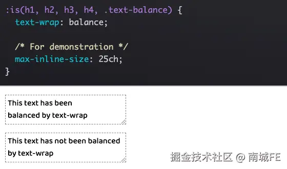 第一个可用的值是 balance,其目标是使每行文本的字符数量均匀分布。该技术对包裹文本的行数有限制,最多为六行,因此最适合用于标题或其他较短的文本段落。限制应用范围也有助于减少对页面渲染速度的影响。