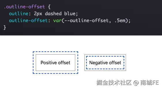 下面演示中,灰色实线是元素边框,蓝色虚线是通过outline-offset定位的轮廓。